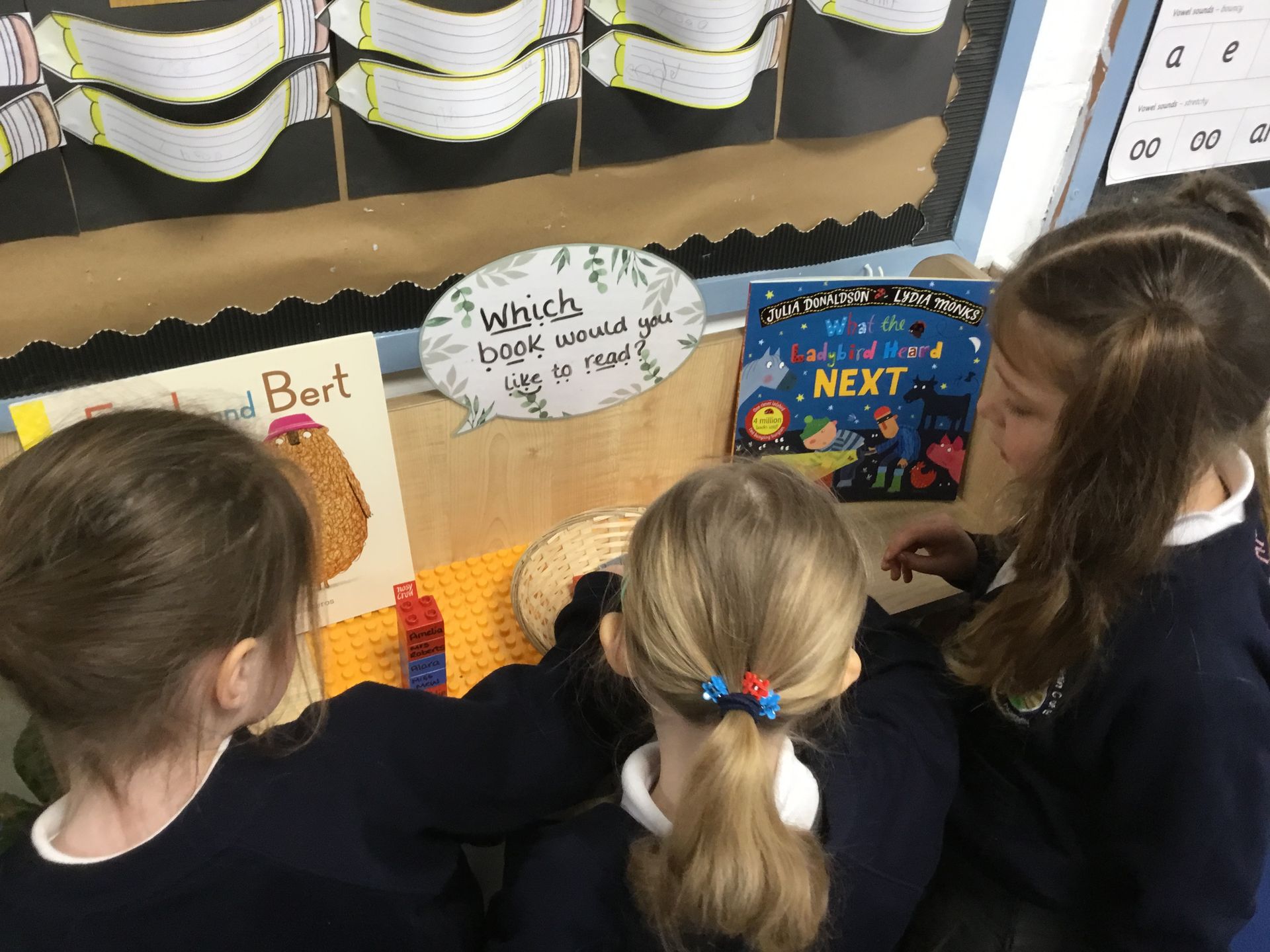 This week we introduced a system in the class for voting for our favourite book that Miss Mew or Mrs Roberts can read to us! We were very excited and kept pointing out which tower was taller, meaning that book had the post votes. Our first class, pick was 'What the Ladybird Heard Next'.